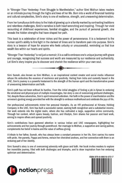 In "Stronger Than Yesterday: From Struggle to Manifestation," author Simi Midhun takes readers on an intimate journey through the highs and lows of her life. Born into a world of financial hardship and cultural complexities, Simi's story is one of resilience, strength, and unwavering determination. From her tumultuous birth story to the trials of growing up in a family marked by contrasting traditions and relentless challenges, Simi's narrative is both heart-wrenching and inspiring. Through her vivid recounting of childhood experiences, familial struggles, and the pursuit of personal growth, she reveals the hidden strengths that have shaped her path. This book is a celebration of inner riches and the power of perseverance. It is a testament to the human spirit's ability to find light in the darkest of times and to transform pain into purpose. Simi's story is a beacon of hope for anyone who feels unlucky or unsuccessful, reminding us that true wealth lies within our hearts and spirits. "Stronger Than Yesterday" is not just a memoir; it is a call to embrace one's unique journey with grace and courage, recognizing that success and worth are measured by our resilience and authenticity. Let Simi's story inspire you to discover and cherish the resilience within your own soul.