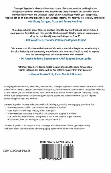 Marrying personal stories, interviews, and statistics, Stronger Together is author Stephanie Yuen's candid memoir that shares a personal journey with Alopecia, an autoimmune condition that causes hair to fall out. As the reader, you will dive deep into Yuen's chronicles as well as fellow Alopecian's inspiring stories, where Yuen takes you on a unique voyage of her life events and breaks down the societal stigmas surrounding bald men and women. Stronger Together inspires reflection and fruitful dialogue, pressing into engaging questions like:How does Alopecia affect one's mental and emotional health? Does appearance change the way others view you? Why do societal standards play such a crucial factor in peoples' daily lives? Due to the fact that they are so engraved in our minds that we might not even realize them, how can we negate those types of mindsets? Stronger Together is as an opportunity to engage with the themes of courage and positivity and learn about the importance of never judging a person based on their appearance.