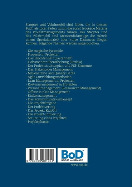 Ideensammlung für praxisnahes Projektmanagement.Projekte scheitern oft an unpräzisem und lückenhaftem Pflichtenheft, fehlender Dokumentation, mangelnder Kommunikation, undisziplinierter Planung und Koordination, sowie fehlenden Ressourcen und an Kompetenzstreitereien.Diese Ideensammlung ist als Hilfe gedacht, um die gröbsten Fehler im Projektmanagement zu vermeiden.Stropter und Volairmobil sind Ideen, welche als roter Faden durch die sonst trockene Materie des Projektmanagements führen. Der Stropter und das Volairmobil sind Straßenfahrzeuge, die mittels einem Spezialantrieb über kurze Distanzen fliegen können. Eine direkte Konkurrenz der beiden Projekte besteht jedoch in den Fallbeispielen nicht. Begleiten Sie mich bei der Entwicklung und Markteinführung dieser beiden Transportmittel.Themen, die in diesem Buch angesprochen werden sind:- Die magische Pyramide- Prozesse in Projekten- Dokumentenüberarbeitungs-Methode- Das Pflichtenheft (Lastenheft)- Der Projektstrukturplan und PSP-Elemente- Die Stakeholder Analyse und das Stakeholder Management- Meilensteine und Quality Gates- Agile Entwicklungsmethoden in klassischem Projektmanagement- Lean Management in Projekten- Kostenmanagement in Projekten- Personalmanagement (Ressourcen Management)- Offene Punkte Management- Risikomanagement- Das Kommunikationskonzept- Vor- und Hauptprojekt- Die Projektfreigabe- Der Projektvertrag- Rollen- und Aufgaben in Projekten: das RASCI Modell- Das Projekt KickOff- Die Projekt-Initiierung- Steuerung eines Projektes- Projektphasen - Idee - Konzept, Architektur (Grobplanung) - Design (Detailplanung) - Aufbau (Build) - Test - Pilotierung - Rollout ("Verteilen", Verkaufen ...) - Cleanup (Abschluss)