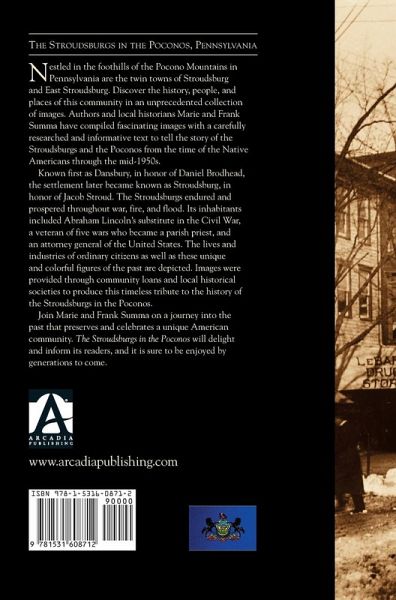Nestled in the foothills of the Pocono Mountains in Pennsylvania are the twin towns of Stroudsburg and East Stroudsburg. Discover the history, people, and places of this community in an unprecedented collection of images. Authors and local historians Marie and Frank Summa have compiled fascinating images with a carefully researched and informative text to tell the story of the Stroudsburgs and the Poconos from the time of the Native Americans through the mid-1950s. Known first as Dansbury, in honor of Daniel Brodhead, the settlement later became known as Stroudsburg, in honor of Jacob Stroud. The Stroudsburgs endured and prospered throughout war, fire, and flood. Its inhabitants included Abraham Lincoln's substitute in the Civil War, a veteran of five wars who became a parish priest, and an attorney general of the United States. The lives and industries of ordinary citizens as well as these unique and colorful figures of the past are depicted. Images were provided through community loans and local historical societies to produce this timeless tribute to the history of the Stroudsburgs in the Poconos.