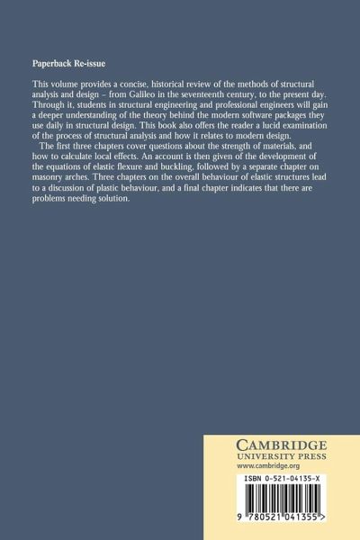 This volume provides a concise, historical review of the methods of structural analysis and design - from Galileo in the seventeenth century, to the present day. Through it, students in structural engineering and professional engineers will gain a deeper understanding of the theory behind the modern software packages they use daily in structural design. This book also offers the reader a lucid examination of the process of structural analysis and how it relates to modern design. The first three chapters cover questions about the strength of materials, and how to calculate local effects. An account is then given of the development of the equations of elastic flexure and buckling, followed by a separate chapter on masonry arches. Three chapters on the overall behaviour of elastic structures lead to a discussion of plastic behaviour, and a final chapter indicates that there are still problems needing solution.