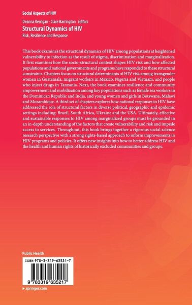 This book examines the structural dynamics of HIV among populations at heightened vulnerability to infection as the result of stigma, discrimination and marginalization. It first examines how the socio-structural context shapes HIV risk and how affected populations and national governments and programs have responded to these structural constraints. Chapters focus on structural determinants of HIV risk among transgender women in Guatemala, migrant workers in Mexico, Nigeria and Vietnam, and people who inject drugs in Tanzania. Next, the book examines resilience and community empowerment and mobilization among key populations such as female sex workers in the Dominican Republic and India, and young women and girls in Botswana, Malawi and Mozambique. A third set of chapters explores how national responses to HIV have addressed the role of structural factors in diverse political, geographic and epidemic settings including: Brazil, South Africa, Ukraine and the USA. Ultimately, effectiveand sustainable responses to HIV among marginalized groups must be grounded in an in-depth understanding of the factors that create vulnerability and risk and impede access to services. Throughout, this book brings together a rigorous social science research perspective with a strong rights-based approach to inform improvements in HIV programs and policies. It offers new insights into how to better address HIV and the health and human rights of historically excluded communities and groups.