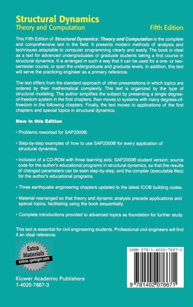 New in this Edition:Problems reworked for SAP2000®.Step-by-step examples of how to use SAP2000® for every application of structural dynamics.Inclusion of companion Web site (extras.springer.com/2004) with three learning aids: SAP2000® student version; source code for the author's educational programs in structural dynamics, so that the results of changed parameters can be seen step-by-step; and the compiler (executable files) for the author's educational programs.Three earthquake engineering chapters updated to the latest ICC® building codes.Materials rearranged so that theory and dynamic analysis precede applications and special topics, facilitating using the book sequentially.Complete instructions provided to advanced topics as foundation for further study.This text is essential for civil engineering students. Professional civil engineers will find it an ideal reference."