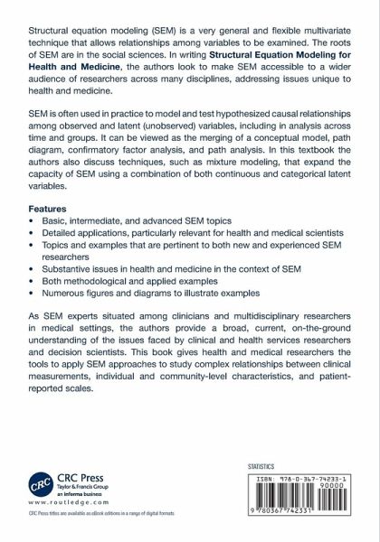 Structural equation modeling (SEM) is a very general and flexible multivariate technique that allows relationships among variables to be examined. The roots of SEM are in the social sciences. In writing this textbook, the authors look to make SEM accessible to a wider audience of researchers across many disciplines, addressing issues unique to health and medicine.