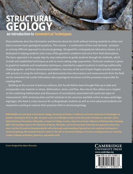 This combination of text and lab book presents an entirely different approach to structural geology. Designed for undergraduate laboratory classes, it provides a step-by-step guide for solving geometric problems arising from structural field observations. The book discusses both traditional methods and cutting-edge approaches, with emphasis given to graphical methods and visualization techniques that support students in tackling challenging two- and three-dimensional problems. Numerous exercises encourage practice in using the techniques, and demonstrate how field observations can be converted into useful information about geological structures and the processes responsible for creating them. This updated fourth edition incorporates new material on stress, deformation, strain and flow, and the underlying mathematics of the subject. With stereonet plots and solutions to the exercises available online at www.cambridge.org/ragan, this book is a key resource for undergraduates, advanced students and researchers wanting to improve their practical skills in structural geology. This volume, a combination of undergraduate text and lab book, provides students with a step-by-step guide to solving geometric problems in structural geology. Updated to incorporate new material on stress, deformation, strain and flow, it emphasises the underlying mathematics and provides numerous homework exercises for which solutions are available online.