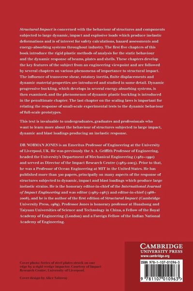 Structural Impact is concerned with the behaviour of structures and components subjected to large dynamic, impact and explosive loads which produce inelastic deformations. It is of interest for safety calculations, hazard assessments and energy absorbing systems throughout industry. The first five chapters introduce the rigid plastic methods of analysis for the static behaviour and the dynamic response of beams, plates and shells. The influence of transverse shear, rotatory inertia, finite displacements and dynamic material properties are introduced and studied in some detail. Dynamic progressive buckling, which develops in several energy absorbing systems, and the phenomenon of dynamic plastic buckling are introduced. Scaling laws are discussed which are important for relating the response of small-scale experimental tests to the dynamic behaviour of full-scale prototypes. This text is invaluable to undergraduates, graduates and professionals learning about the behaviour of structures subjected to large impact, dynamic and blast loadings producing an inelastic response.
