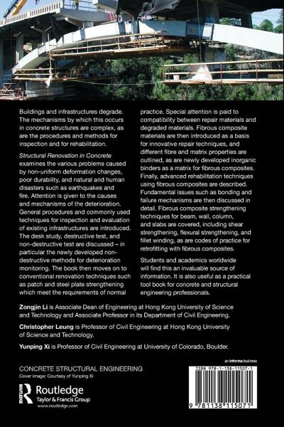 The mechanisms by which buildings and infrastructures degrade are complex, as are the procedures and methods for inspection and for rehabilitation. This book examines the various problems caused by non-uniform deformation changes, poor durability, and natural and human disasters such as earthquakes and fire. It explores the causes and mechanisms of deterioration and introduces general procedures and commonly used techniques for inspection and evaluation of existing infrastructures. The book examines conventional renovation techniques, compatibility between repair materials and degraded materials, and fibrous composite materials. It also discusses fibrous composite strengthening techniques for beam, wall, column and slabs along with codes of practice for retrofitting with fibrous composites.