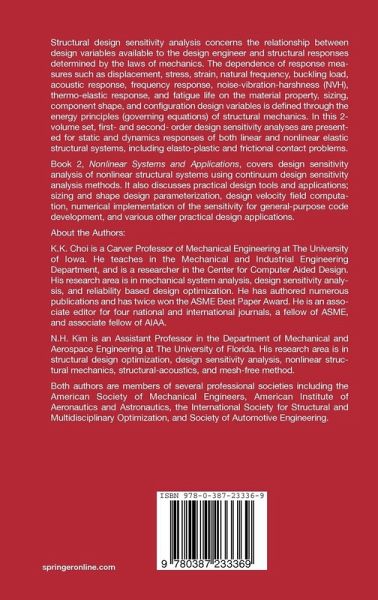 Structural design sensitivity analysis concerns the relationship between design variables available to the design engineer and structural responses determined by the laws of mechanics. The dependence of response measures such as displacement, stress, strain, natural frequency, buckling load, acoustic response, frequency response, noise-vibration-harshness (NVH), thermo-elastic response, and fatigue life on the material property, sizing, component shape, and configuration design variables is defined through the governing equations of structural mechanics. In this 2-volume set, first- and second- order design sensitivity analyses are presented for static and dynamics responses of both linear and nonlinear elastic structural systems, including elasto-plastic and frictional contact problems.