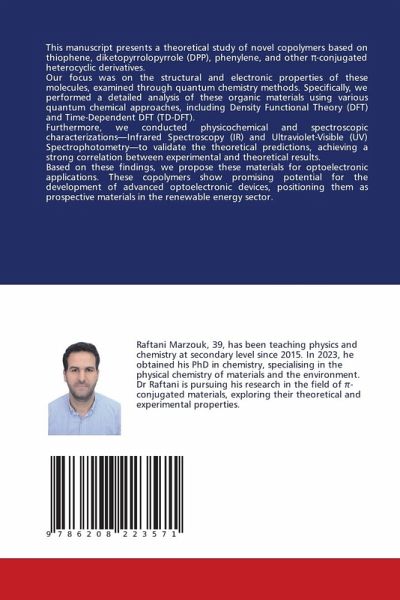 This manuscript presents a theoretical study of novel copolymers based on thiophene, diketopyrrolopyrrole (DPP), phenylene, and other pi-conjugated heterocyclic derivatives.Our focus was on the structural and electronic properties of these molecules, examined through quantum chemistry methods. Specifically, we performed a detailed analysis of these organic materials using various quantum chemical approaches, including Density Functional Theory (DFT) and Time-Dependent DFT (TD-DFT).Furthermore, we conducted physicochemical and spectroscopic characterizations-Infrared Spectroscopy (IR) and Ultraviolet-Visible (UV) Spectrophotometry-to validate the theoretical predictions, achieving a strong correlation between experimental and theoretical results.Based on these findings, we propose these materials for optoelectronic applications. These copolymers show promising potential for the development of advanced optoelectronic devices, positioning them as prospective materials in the renewable energy sector.