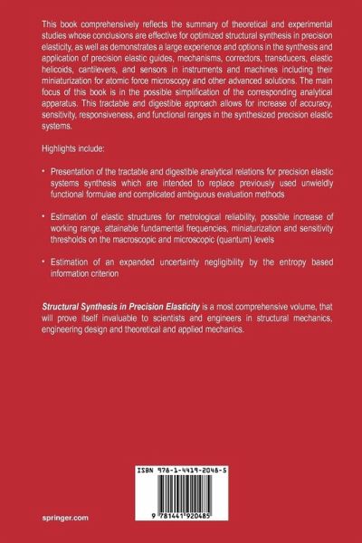 Structural Synthesis in Precision Elasticity reflects the summary of theoretical and experimental studies whose conclusions are effective for optimized structural synthesis in precision elasticity, as well as demonstrate a large experience and options in the synthesis, production, application of precision elastic guides, mechanisms, correctors, transducers, instruments and machines. The main focus of this book is in the possible simplification of the corresponding analytical apparatus by using kinematical equivalents, matrix methods, appropriate contours, and function expansion with enough accurate minimal polynomials. This approach allows for substitution of some known unwieldy formulae and methods that are not convenient for digestible and tractable synthesis.