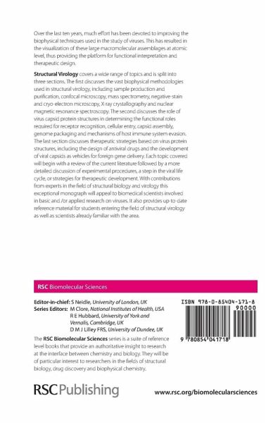 Over the last ten years, much effort has been devoted to improving the biophysical techniques used in the study of viruses. This has resulted in the visualization of these large macromolecular assemblages at atomic level, thus providing the platform for functional interpretation and therapeutic design. Structural Virology covers a wide range of topics and is split into three sections. The first discusses the vast biophysical methodologies used in structural virology, including sample production and purification, confocal microscopy, mass spectrometry, negative-stain and cryo-electron microscopy, X-ray crystallography and nuclear magnetic resonance spectroscopy. The second discusses the role of virus capsid protein structures in determining the functional roles required for receptor recognition, cellular entry, capsid assembly, genome packaging and mechanisms of host immune system evasion. The last section discusses therapeutic strategies based on virus protein structures, including the design of antiviral drugs and the development of viral capsids as vehicles for foreign gene delivery. Each topic covered will begin with a review of the current literature followed by a more detailed discussion of experimental procedures, a step in the viral life cycle, or strategies for therapeutic development. With contributions from experts in the field of structural biology and virology this exceptional monograph will appeal to biomedical scientists involved in basic and /or applied research on viruses. It also provides up-to-date reference material for students entering the field of structural virology as well as scientists already familiar with the area.