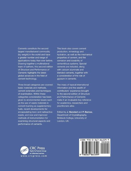 Drawing together a multinational team of authors, this second edition of Structure and Performance of Cements highlights the latest global advances in the field of cement technology. Three broad categories are covered: basic materials and methods, cement extenders, and techniques of examination. Within these categories consideration has been given to environmental issues such as the use of waste materials in cement-burning as supplementary fuels and new and improved methods of instrumentation for examining structural aspects and performance of cements. This book also covers cement production, mineralogy and hydration, as well as the mechanical properties of cement, and the corrosion and durability of cementitious systems. Special cements are included, along with calcium aluminate and blended cements together with a consideration of the role of gypsum in cements. Structure and Performance of Cements is an invaluable key reference for academics, researchers and practitioners alike.