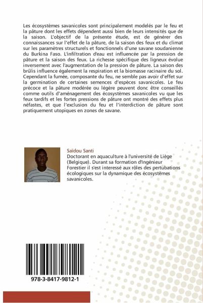 Les écosystèmes savanicoles sont principalement modelés par le feu et la pâture dont les effets dépendent aussi bien de leurs intensités que de la saison. L'objectif de la présente étude, est de générer des connaissances sur l'effet de la pâture, de la saison des feux et du climat sur les paramètres structurels et fonctionnels d'une savane soudanienne du Burkina Faso. L'infiltration d'eau est influencée par la pression de pâture et la saison des feux. La richesse spécifique des ligneux évolue inversement avec l'augmentation de la pression de pâture. La saison des brûlis influence également la respiration et la biomasse racinaire du sol. Cependant la fumée, composante du feu, ne semble pas avoir d'effet sur la germination de certaines semences d'espèces savanicoles. Le feu précoce et la pâture modérée ou légère peuvent donc être conseillés comme outils d'aménagement des écosystèmes savanicoles vu que les feux tardifs et les fortes pressions de pâture ont montré des effets plus néfastes, et que l'exclusion du feu et l'interdiction de pâture sont pratiquement utopiques en zones de savane.