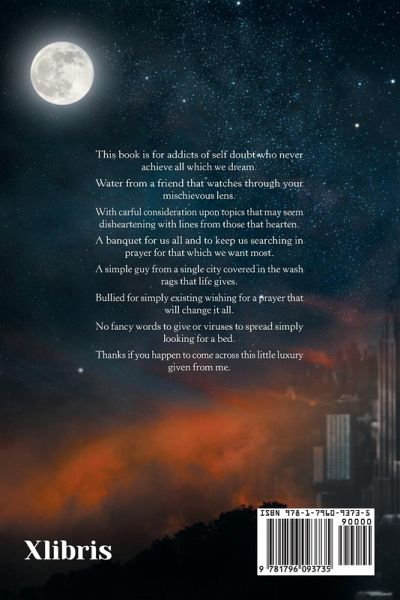 This book is for addicts of self doubt who never achieve all which we dream. Water from a friend that watches through your mischievous lens. With carful consideration upon topics that may seem disheartening with lines from those that hearten. A banquet for us all and to keep us searching in prayer for that which we want most. A simple guy from a single city covered in the wash rags that life gives. Bullied for simply existing wishing for a prayer that will change it all. No fancy words to give or viruses to spread simply looking for a bed. Thanks if you happen to come across this little luxury given from me.