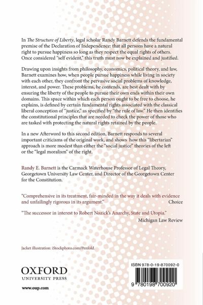 In this book, legal scholar Randy Barnett elaborates and defends the fundamental premise of the Declaration of Independence: that all persons have a natural right to pursue happiness so long as they respect the equal rights of others, and that governments are only justly established to secure these rights. Drawing upon insights from philosophy, economics, political theory, and law, Barnett explains why, when people pursue happiness while living in society with each other, they confront the pervasive social problems of knowledge, interest and power. These problems are best dealt with by ensuring the liberty of the people to pursue their own ends, but this liberty is distinguished from "license" by certain fundamental rights and procedures associated with the classical liberal conception of "justice" and "the rule of law." He then outlines the constitutional framework that is needed to put these principles into practice. In a new Afterword to this second edition, Barnett elaborates on this thesis by responding to several important criticisms of the original work. He then explains how this "libertarian" approach is more modest than either the "social justice" theories of the left or the "legal moralism" of the right.
