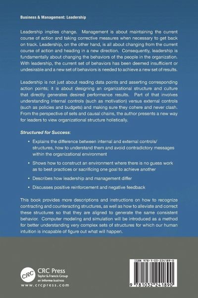 Leadership is not just about reading data points and asserting corresponding action points; it is about designing an organizational structure and culture that directly generates desired performance results. Part of that involves understanding internal controls (such as motivation) versus external controls (such as policies and budgets) and making sure they cohere and never clash. From the perspective of sets and causal chains, the author presents a new way for leaders to view organizational structure holistically. A website accompanies the book with models and simulations that help map out these complex sets and predict/analyze results.