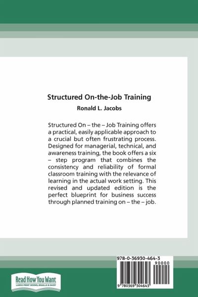 Structured On - the - Job Training offers a practical, easily applicable approach to a crucial but often frustrating process. Designed for managerial, technical, and awareness training, the book offers a six - step program that combines the consistency and reliability of formal classroom training with the relevance of learning in the actual work setting. This revised and updated edition is the perfect blueprint for business success through planned training on - the - job.