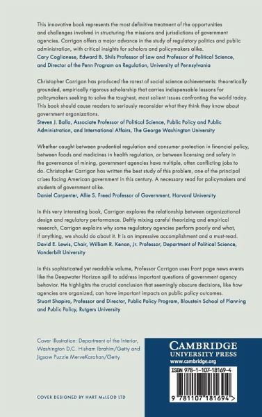 In the search for explanations for three of the most pressing crises of the early twenty-first century (the housing meltdown and financial crisis, the Gulf oil spill, and the nuclear disaster at Fukushima), commentators pointed to the structure of the regulatory agencies charged with overseeing the associated industries, noting that the need to balance competing regulatory and non-regulatory missions undermined each agency's ability to be an effective regulator. Christopher Carrigan challenges this critique by employing a diverse set of research methods, including a statistical analysis, an in-depth case study of US regulatory oversight of offshore oil and gas development leading up to the Gulf oil spill, and a formal theoretical discussion, to systematically evaluate the benefits and concerns associated with either combining or separating regulatory and non-regulatory missions. His analysis demonstrates for policymakers and scholars why assigning competing non-regulatory missions to regulatory agencies can still be better than separating them in some cases.