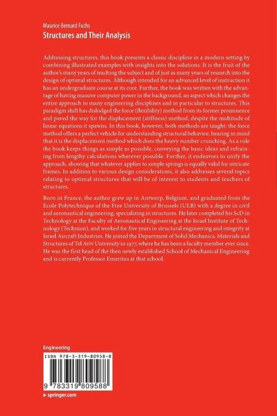 Born in France, the author grew up in Antwerp, Belgium, and graduated from the Ecole Polytechnique of the Free University of Brussels (ULB) with a degree in civil and aeronautical engineering, specializing in structures. He later completed his ScD in Technology at the Faculty of Aeronautical Engineering at the Israel Institute of Technology (Technion), and worked for five years in structural engineering and integrity at Israel Aircraft Industries. He joined the Department of Solid Mechanics, Materials and Structures of Tel Aviv University in 1977, where he has been a faculty member ever since. He was the first head of the then newly established School of Mechanical Engineering and is currently Professor Emeritus at that school. The author has taught basic and advanced undergraduate courses in structural analysis and aircraft analysis and design, as well as graduate courses in finite-element analysis and structural optimization. He has also taught structures courses to architectural students at the Faculty of Architecture at the Technion and at the School of Architecture of Tel Aviv University. He has been a visiting assistant professor at the School of Engineering at UCLA, a visiting scholar at the Engineering Department of Cambridge University and a visiting professor at the Joseph Fourier Université de Grenoble. He was a founding member of the ISSMO (International Society of Structural and Multidisciplinary Optimization) and has been a regular contributor to its conferences and meetings. His research field is the design of optimal structures, in which he has published over 50 papers.