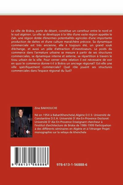 La ville de Biskra, porte de désert, constitue un carrefour entre le nord et le sud algérien. La ville se développe à la tête d'une vaste région appelée le Zab, une région dotée d'énormes potentialités agricoles d'une importante production de dattes et d'une culture maraîchère précoce. Sa dynamique commerciale est très ancienne, elle à toujours été, un grand souk d'échange, et aussi un pôle d'attraction d'investisseurs. Le poids du commerce dans l'armature urbaine se mesure à partir de ses structures commerciales, sa dynamique interne et externe, sa répartition à travers le tissu urbain de la ville. Pour cerner cette relation il est nécessaire de voir en quoi le commerce donne-t-il à Biskra un ancrage régional? Est-elle une ville spécifiquement commerciale? Quel rôle jouent ses structures commerciales dans l'espace régional du Sud?