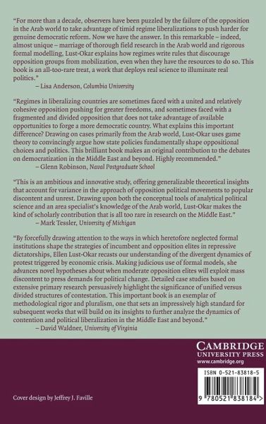 'For more than a decade, observers have been puzzled by the failure of the opposition in the Arab world to take advantage of timid regime liberalizations to push harder for genuine democratic reform. Now we have the answer. In this remarkable - indeed, almost unique - marriage of thorough field research in the Arab world and rigorous formal modelling, Lust-Okar explains how regimes write rules that discourage opposition groups from mobilization, even when they have the resources to do so. This book is an all too-rare treat, a work that deploys real science to illuminate real politics.' Lisa Anderson, Columbia University