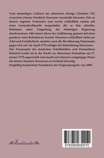 Das Trauerspiel des deutschen Schriftstellers und Dramatikers Heinrich Laube ist in der Nacht vor Struensees Festnahme am 17. Januar 1772 angesiedelt und macht auf intensive-eingängige Weise die letzten Stunden Struensees in Freiheit lebendig.