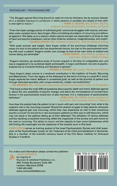 This book deals with obstacles in the mourning process as experienced in individual cases and in large groups, in normative and in life-threatening situations. Rich in clinical examples from the author's practice, it describes the therapeutic tools that the author employed to achieve healthy outcomes. Additionally, the book focuses on various defenses, their function and importance, and on the difficulty of relinquishing them-and highlights the therapist's dilemmas in these contexts.