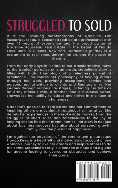 It is the inspiring autobiography of Madeline Ann Russo-Rousseau, a seasoned real estate professional with over 15 years of experience and the proud owner of Madeline Rousseau Real Estate in the beautiful Florida Keys. Born in Queens, New York, Madeline's journey is a testament to resilience, determination, and the power of dreams. From her early days in Florida to her transformative move to the tropical paradise of Islamorada, Madeline's story is filled with trials, triumphs, and a relentless pursuit of excellence. She shares her philosophy of helping others through her work, providing exceptional service and personalized attention to clients and Realtors alike. Her journey through various life stages, including her time as an Army officer's wife, a mother, and a business owner, showcases her ability to adapt and thrive in the face of challenges. Madeline's passion for real estate and her commitment to inspiring others are evident throughout her narrative. She details her experiences in the real estate market, from the struggles of short sales and foreclosures to the joy of helping clients find their dream homes. Her story is not just about business success but also about personal growth, family, and the pursuit of happiness. Set against the backdrop of the serene and picturesque Florida Keys, is a heartfelt and motivational account of one woman's journey to live her dream and inspire others to do the same. Madeline's story is a beacon of hope and a guide for anyone looking to overcome obstacles and achieve their goals.