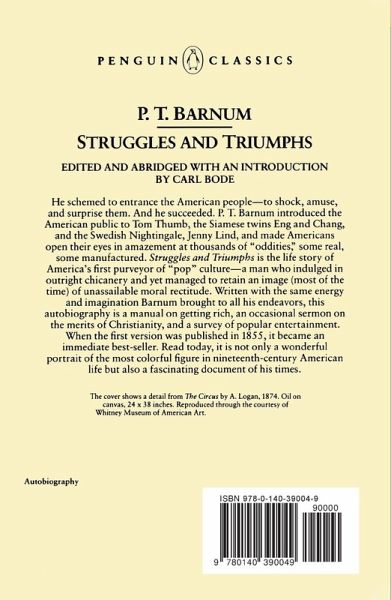 Written with the same energy and imagination Barnum brought to all his endeavors, this autobiography is a manual on getting rich, an occasional sermon on the merits of Christianity, and a survey of popular entertainment. When the first version was published in 1855, it became an immediate bestseller. Read today, it is not only a wonderful portrait of the most colorful figure in nineteenth-century American life but also a fascinating document of his times. He schemed to entrance the American people-to shock, amuse, and surprise them. And he succeeded. P.T. Barnum introduced the American public to Tom Thumb, the Siamese twins Chang and Eng, and the Swedish Nightingale, Jenny Lind. He made Americans open their eyes in amazement at thousands of "oddities," some real, some manufactured. Struggles and Triumphs is the life story of America's first purveyor of pop culture-a man who indulged in outright chicanery and yet managed to retain an image (most of the time) of unassailable moral rectitude.