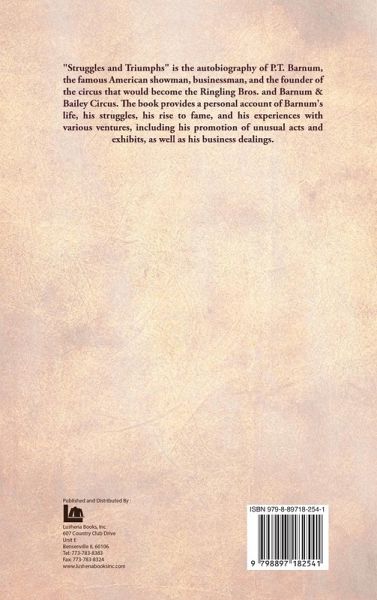 "Struggles and Triumphs" is the autobiography of P.T. Barnum, the famous American showman, businessman, and the founder of the circus that would become the Ringling Bros. and Barnum & Bailey Circus. The book provides a personal account of Barnum's life, his struggles, his rise to fame, and his experiences with various ventures, including his promotion of unusual acts and exhibits, as well as his business dealings.