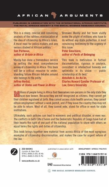 Hundreds of thousands of people living in Africa find themselves non-persons in the only state they have ever known. Because they are not recognised as citizens, they cannot get their children registered at birth or entered in school or university; they cannot access state health services; they cannot obtain travel documents, or employment without a work permit; and if they leave the country they may not be able to return. Most of all, they cannot vote, stand for office, or work for state institutions. Ultimately such policies can lead to economic and political disaster, or even war. The conflicts in both Côte d'Ivoire and the Democratic Republic of Congo have had at their hearts the very right of one part of the national population to share with others on equal terms the rights and duties of citizenship. This book brings together new material from across Africa of the most egregious examples of citizenship discrimination, and makes the case for urgent reform of the law.