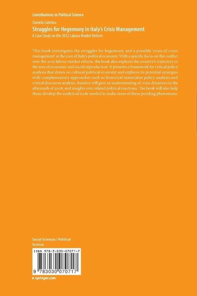 This book investigates the struggles for hegemony, and a possible 'crisis of crisis management' at the core of Italy's political economy. With a specific focus on the conflict over the 2012 labour market reform, the book also explores the country's trajectory in the area of economic and social reproduction. It presents a framework for critical policy analysis that draws on cultural political economy and explores its potential synergies with complementary approaches such as historical materialist policy analysis and critical discourse analysis. Readers will gain an understanding of crisis dynamics in the aftermath of 2008, and insights into related political reactions. The book will also help them develop the analytical tools needed to make sense of these puzzling phenomena.