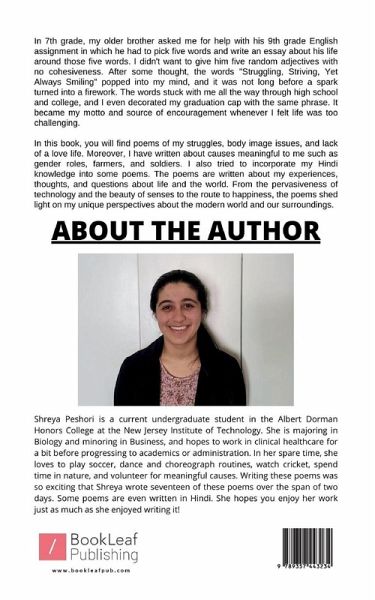 ""In 7th grade, my older brother asked me for help with his 9th grade English assignment in which he had to pick five words and write an essay about his life around those five words. I didn't want to give him five random adjectives with no cohesiveness. After some thought, the words """"Struggling, Striving, Yet Always Smiling"""" popped into my mind, and it was not long before a spark turned into a firework. The words stuck with me all the way through high school and college, and I even decorated my graduation cap with the same phrase. It became my motto and source of encouragement whenever I felt life was too challenging. In this book, you will find poems of my struggles, body image issues, and lack of a love life. Moreover, I have written about causes meaningful to me such as gender roles, farmers, and soldiers. I also tried to incorporate my Hindi knowledge into some poems. The poems are written about my experiences, thoughts, and questions about life and the world. From the pervasiveness of technology and the beauty of senses to the route to happiness, the poems shed light on my unique perspectives about the modern world and our surroundings.""