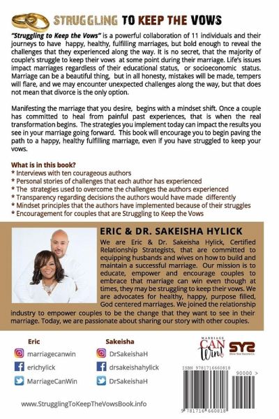 "Struggling to Keep the Vows" is a powerful collaboration of 10 individuals and their journeys to have happy, healthy, fulfilling marriages, but bold enough to reveal the challenges that they experienced along the way. It is no secret, that the majority of couple's struggle to keep their vows at some point during their marriage. Life's issues impact marriages regardless of their educational status, or socioeconomic status. Marriage can be a beautiful thing, but in all honesty, mistakes will be made, tempers will flare, and we may encounter unexpected challenges along the way, but that does not mean that divorce is the only option. Manifesting the marriage that you desire, begins with a mindset shift. Once a couple has committed to heal from painful past experiences, that is when the real transformation begins. The strategies you implement today can impact the results you see in your marriage going forward. This book will encourage you to begin paving the path to a happy, healthy fulfilling marriage, even if you have struggled to keep your vows. What is in this book? * Interviews with ten courageous authors * Personal stories of challenges that each author has experienced * The strategies used to overcome the challenges the authors experienced * Transparency regarding decisions the authors would have made differently * Mindset principles that the authors have implemented because of their struggles * Encouragement for couples that are Struggling to Keep the Vows