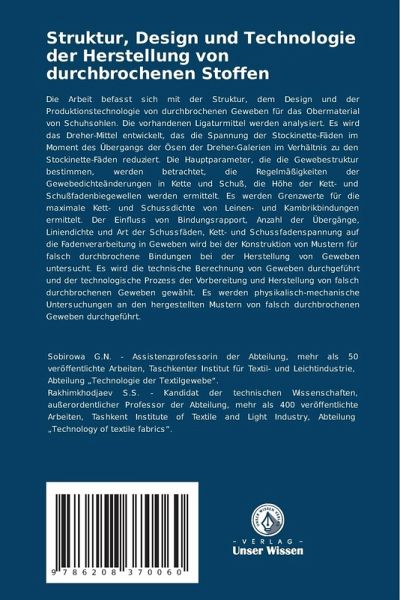 Die Arbeit befasst sich mit der Struktur, dem Design und der Produktionstechnologie von durchbrochenen Geweben für das Obermaterial von Schuhsohlen. Die vorhandenen Ligaturmittel werden analysiert. Es wird das Dreher-Mittel entwickelt, das die Spannung der Stockinette-Fäden im Moment des Übergangs der Ösen der Dreher-Galerien im Verhältnis zu den Stockinette-Fäden reduziert. Die Hauptparameter, die die Gewebestruktur bestimmen, werden betrachtet, die Regelmäßigkeiten der Gewebedichteänderungen in Kette und Schuß, die Höhe der Kett- und Schußfadenbiegewellen werden ermittelt. Es werden Grenzwerte für die maximale Kett- und Schussdichte von Leinen- und Kambrikbindungen ermittelt. Der Einfluss von Bindungsrapport, Anzahl der Übergänge, Liniendichte und Art der Schussfäden, Kett- und Schussfadenspannung auf die Fadenverarbeitung in Geweben wird bei der Konstruktion von Mustern für falsch durchbrochene Bindungen bei der Herstellung von Geweben untersucht. Es wird die technische Berechnung von Geweben durchgeführt und der technologische Prozess der Vorbereitung und Herstellung von falsch durchbrochenen Geweben gewählt. Es werden physikalisch-mechanische Untersuchungen an den hergestellten Mustern von falsch durchbrochenen Geweben durchgeführt.