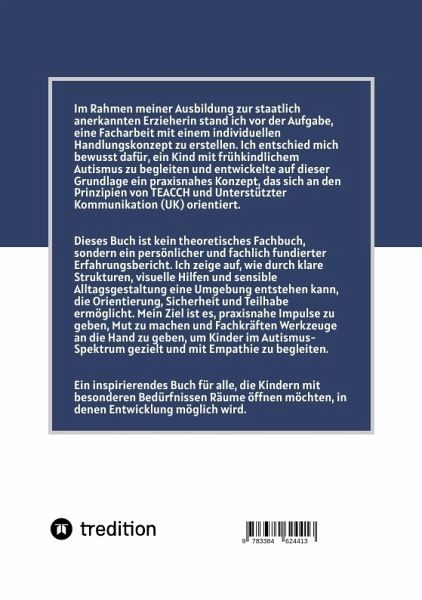Ein berührender Praxisbericht über den Alltag mit einem autistischen Kind - anschaulich, praxisnah und inspirierend.In diesem einfühlsam geschriebenen Buch teilt die Autorin ihre persönlichen Erfahrungen aus ihrer Arbeit mit Markus, einem Jungen mit frühkindlichem Autismus. Auf Basis einer Facharbeit, die im Rahmen ihrer Ausbildung zur Erzieherin entstand, entwickelte sie ein individuelles Förderkonzept mit den Schwerpunkten TEACCH-Ansatz und Unterstützte Kommunikation (UK).Das Buch ist keine trockene Fachliteratur, sondern eine praxisorientierte Erzählung, die zeigt, wie durch Struktur, visuelle Hilfen und ein feinfühliger Umgang der Alltag für autistische Kinder erleichtert und bereichert werden kann. Die Autorin möchte Mut machen, neue Wege aufzeigen und ihre Leser:innen dazu inspirieren, kleine Veränderungen im pädagogischen Alltag mit großer Wirkung umzusetzen.Ideal für Pädagog:innen, Fachkräfte, Eltern und alle, die sich für Autismus und inklusive Förderung interessieren.