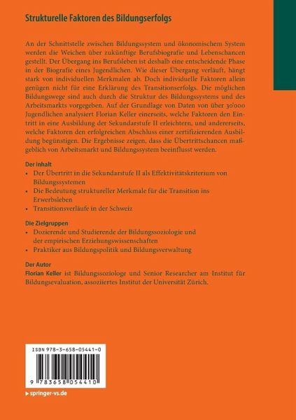 An der Schnittstelle zwischen Bildungssystem und ökonomischem System werden die Weichen über zukünftige Berufsbiografie und Lebenschancen gestellt. Der Übergang ins Berufsleben ist deshalb eine entscheidende Phase in der Biografie eines Jugendlichen. Wie dieser Übergang verläuft, hängt stark von individuellen Merkmalen ab. Doch individuelle Faktoren allein genügen nicht für eine Erklärung des Transitionserfolgs. Die möglichen Bildungswege sind auch durch die Struktur des Bildungssystems und des Arbeitsmarkts vorgegeben. Auf der Grundlage von Daten von über 30.000 Jugendlichen analysiert Florian Keller einerseits, welche Faktoren den Eintritt in eine Ausbildung der Sekundarstufe II erleichtern, und andererseits, welche Faktoren den erfolgreichen Abschluss einer zertifizierenden Ausbildung begünstigen. Die Ergebnisse zeigen, dass die Übertrittschancen maßgeblich von Arbeitsmarkt und Bildungssystem beeinflusst werden.