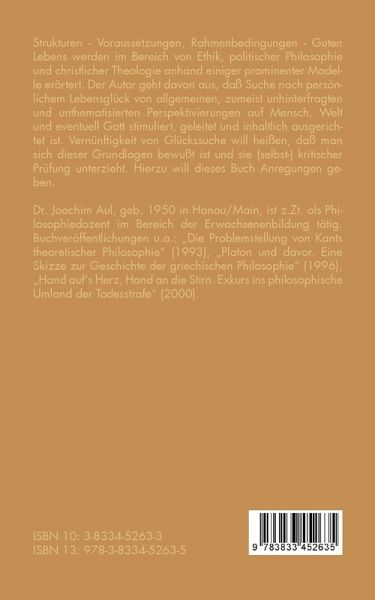 Strukturen - Voraussetzungen, Rahmenbedingungen - Guten Lebens werden im Bereich von Ethik, politischer Philosophie und christlicher Theologie anhand einiger prominenter Modelle erörtert. Der Autor geht davon aus, daß Suche nach persönlichem Lebensglück von allgemeinen, zumeist unhinterfragten und unthematisierten Perspektivierungen auf Mensch, Welt und eventuell Gott stimuliert, geleitet und inhaltlich ausgerichtet ist. Vernünftigkeit von Glückssuche will heißen, daß man sich dieser Grundlagen bewußt ist und sie (selbst-) kritischer Prüfung unterzieht. Hierzu will dieses Buch Anregungen geben. "Freilich setzt die Lektüre einige Kenntnisse auf dem Gebiet der Philosophie voraus"