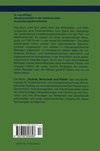 Das Buch zieht fünf Jahre nach der Wirtschafts- und Währungsunion eine Zwischenbilanz zum Stand des Übergangs der ostdeutschen Investitionsgüterindustrie von der Plan- zur Marktwirtschaft. Es basiert auf einer repräsentativen Befragung von 788 Firmen in den neuen Bundesländern. Die dabei gewonnenen Daten wurden nach verschiedenen Gesichtspunkten ausgewertet und werden in themenspezifischen Beiträgen präsentiert. Im Vordergrund stehen dabei die veränderten Produkt- und Vertriebsstrukturen, technische und organisatorische Innovationen in der Produktion sowie personalpolitische Veränderungen. Durch die in den verschiedenen Beiträgen dieses Sammelbandes dokumentierten Fakten und Analysen erfährt der Leser, welche Strategien die ostdeutschen Betriebe nach der Wende gewählt haben und wo sie heute stehen.