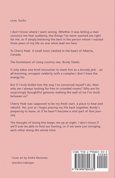 Love. Sucks. I don't know where I went wrong. Whether it was letting a man convince me that suddenly, the things I've never wanted are right for me, or if simply believing the best in the person who I wasted three years of my life on was what lead me here. To Cherry Peak. A small town nestled in the heart of Alberta, Canada. The hometown of rising country star, Brody Steele. It only takes one brief encounter to mark him as a broody jerk. An all-knowing, arrogant celebrity with a complex I don't have the energy for. But if I truly dislike him the way I've convinced myself I do, then why am I always looking for him in crowded rooms? Why are his surprisingly thoughtful gestures melting the wall of ice I've stuck between us? Cherry Peak was supposed to be my fresh start, a place to heal and rebuild. Yet, just as I begin piecing my life back together, Brody's preparing to leave, as if he hasn't become a vital part of that journey. The thought of losing him keeps me up at night. I don't know if we'll ever be able to find our footing, or if we were just stringing each other along the whole time.