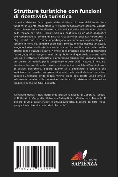 Le unità abitative fanno parte delle strutture di base dell'infrastruttura turistica, in quanto consentono ai visitatori di soggiornare nell'area visitata. Questo lavoro mira a localizzare tutte le unità ricettive individuali e collettive della regione di studio. L'area studiata è costituita da un asse geografico che comprende le contee di Bistri¿a-N¿s¿ud-Mure¿-Suceava-Maramure¿ e Cluj, poiché queste contee appartengono alle aree più importanti per il turismo in Romania. Vengono esaminati i concetti di unità ricettive analizzati. Vengono inoltre analizzate le caratteristiche di classificazione delle qualità offerte dalle strutture ricettive. A livello delle principali città che compongono l'asse geografico, vengono analizzati gli hotel a cinque stelle presenti nella località. Il software SketchUp e il programma Cohom.com vengono utilizzati per creare un modello per la progettazione delle unità ricettive. Si tratta di un elemento centrale nella creazione di una guida completa all'architettura e al design alberghiero. Sapere quanto si è soddisfatti è tutt'altro che sufficiente: un quadro completo di analisi della soddisfazione dei clienti basato su tecniche ibride di text mining. Viene così creato un sistema di valutazione basato sulle recensioni dei turisti. Il sistema di valutazione modulare si chiama STAR Etiquette.