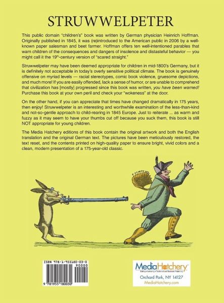 This public domain "children's" book was written by German physician Heinrich Hoffmann. Originally published in 1845, it was (re)introduced to the American public in 2006 by a well-known paper salesman and beet farmer. Dr. Hoffmann offers ten well-intentioned parables that warn children of the consequences and dangers of insolence and distasteful behavior -- you might call it the 19th-century version of "scared straight." Struwwelpeter may have been deemed appropriate for children in mid-1800's Germany, but it is definitely not acceptable in today's overly sensitive political climate. The book is genuinely offensive on myriad levels - racial stereotypes, comic book violence, gruesome depictions, and much more! If you are easily offended, lack a sense of humor, or are unable to comprehend that civilization has [mostly] progressed since this book was written, you have been warned! Purchase this book at your own peril and check your "wokeness" at the door. On the other hand, if you can appreciate that times have changed dramatically in 175 years, then enjoy! Struwwelpeter is an interesting and worthwhile examination of the less-than-kind and not-so-gentle approach to child-rearing in 1845 Europe. Just to reiterate ... as warm and fuzzy as it may be to have your thumbs cut off because you suck them, this book is still NOT appropriate for young children. The Media Hatchery editions of this book contain the original artwork and both the English translation and the original German text. The pictures have been meticulously restored, the type reset, and the contents printed on high-quality paper to ensure bright, vivid colors and a clean, modern presentation of a 175-year-old classic.
