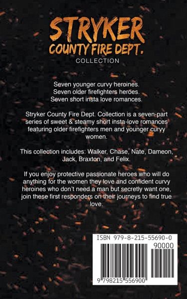 Seven younger curvy heroines. Seven older firefighters heroes. Seven short insta love romances. Stryker County Fire Dept. Collection is a seven-part series of sweet & steamy short insta-love romances featuring older firefighters men and younger curvy women. Check out Walker, Chase, Nate, Dameon, Jack, Braxton, and Felix if you enjoy protective passionate heroes who will do anything for the women they love and confident curvy heroines who don't need a man but secretly want one. Seven HEAs. NO cliffhangers. If you love the Stryker County world and first responders, be sure to check out the Stryker County EMS Collection and the Stryker County PD Collection!