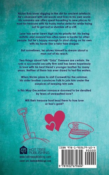 Will their treasure hunt lead them to true love or fool's gold? Niclas Ruiz loves digging in the dirt for ancient artifacts. He's obsessed with old words and lives in his own world. His summers are often spent traveling to new places to hunt for treasure with his trusty metal detector while trying not to get lost or stumble off a cliff. Love has never been high on his priority list. His being autistic and asexual has often been a hurdle for other people. But he's happy enough to plod along on his own with his horde like a fairy-tale dragon. But sometimes, he allows himself to dream about a man out of his reach. Two things about Falk "Grizz" Evensen are certain. He runs a successful security firm and has been hopelessly in love with his best friend's younger brother for many years. Neither of them has ever dared to test the waters. When Niclas plans to visit Cornwall for the summer, his older brother convinces Falk to join him under the auspices of keeping him safe. Is this May-December romance doomed to be derailed by fears of unrequited love? Will their treasure hunt lead them to true love or fool's gold?