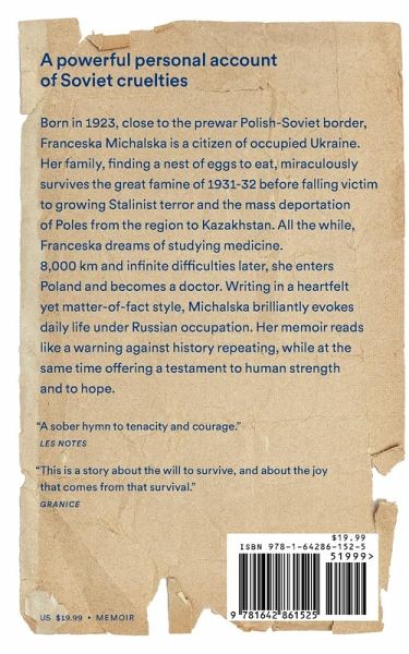 A memoir of the Russian occupation of Ukraine in the 1930s and the mass deportation of Poles from the region. "Not an easy read, but an important one." -Historical Novel Society The end of the 1920s, the author's first memory: a knock on the door and the arrest of her uncle, guilty of "anti-Soviet activities.” He is to be executed. Born in 1923, a dozen or so kilometers from the pre-war Polish-Soviet border, Franceska Michalska is a citizen of occupied Ukraine. Her family, finding a nest of eggs to eat, miraculously survive the great famine of 1931-32 before falling victim to growing Stalinist terror and the mass deportation of Poles from the region to Kazakhstan. All the while, Franceska dreams of studying medicine. 8,000 km and infinite difficulties later, she enters Poland and becomes a doctor, finally obtaining the Polish nationality she never had. Writing in a heartfelt yet matter-of-fact style, Michalska brilliantly evokes daily life under Russian occupation. Now more than ever, this memoir reads like a warning against history repeating, while at the same time offering a testament to human strength and to hope.