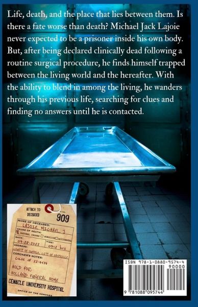 Life, death, and the place that lies between them. Is there a fate worse than death? Michael Jack Lajoie never expected to be a prisoner inside his own body. But, after being declared clinically dead following a routine surgical procedure, he finds himself trapped between the living world and the hereafter. With the ability to blend in among the living, he wanders through his previous life, searching for clues and finding no answers until he is contacted. Michael "Jack" Lajoie struggles with being declared clinically dead after a routine medical procedure but can still walk amongst the living. He awakens to this new world and seeks clues as to who is responsible for his condition. His wife, Ellen, is all alone and struggles to come to grips with his sudden loss and starts to experience several strange phenomena in her home and private life. While inside Calverton National Cemetery, attending his own funeral, Jack sees the odd behavior of four people in the vast field of headstones; he now believes that his wife may be in danger. While temporarily sheltered in the tool shed behind his home, he is approached by Alex, another victim of what is turning out to be a group explicitly harvested from the population. This group of the deceased is composed of all medically terminal military personnel. One evening as Jack's wife Ellen sleeps inside their home, an intruder enters and draws Jack inside. The intruder, Paul Jennings, is seeking to find the rest of his experimental group that has gone missing and the person responsible for their condition, Dr. Phillipe Sixto. However, there is a link between the group of the deceased and a coalition comprised of elected government officials, entrepreneur billionaires, and doctors. The coalition harvested the group for an unknown mission and is now seeking them out by any means necessary.