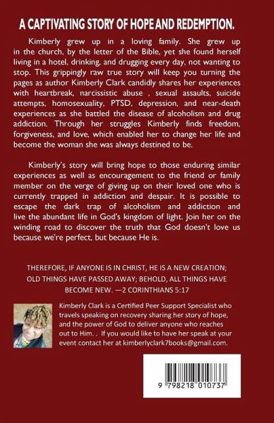 A captivating story of hope and redemption. Kimberly grew up in a loving family. She grew up in the church, by the letter of the Bible, yet she found herself living in a hotel, drinking, and drugging every day, not wanting to stop. This grippingly raw true story will keep you turning the pages. Author Kimberly Clark holds no punches as she lays out the bare and ugly truth of how this terrible disease of addiction and alcoholism destroys lives. She candidly shares her experiences with heartache, heartbreak, sexual assaults, suicide attempts, homosexuality, PTSD, depression, and near-death experiences while walking the road to recovery. Through her struggles, Kimberly finds freedom, forgiveness, and love, which enabled her to change her life and become the woman she was always destined to be. Kimberly's story will bring hope to those enduring similar experiences as well as encouragement to the friend or family member on the verge of giving up on their loved one who is currently trapped in addiction and despair. It is possible to escape the dark trap of alcoholism and addiction and live an abundant life in God's kingdom of light. Join her on the winding road to discover the truth that God doesn't love us because we're perfect, but because He is.