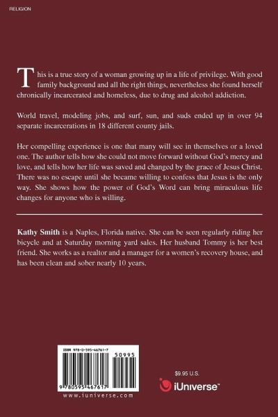 This is a true story of a woman growing up in a life of privilege. With good family background and all the right things, nevertheless she found herself chronically incarcerated and homeless, due to drug and alcohol addiction. World travel, modeling jobs, and surf, sun, and suds ended up in over 94 separate incarcerations in 18 different county jails. Her compelling experience is one that many will see in themselves or a loved one. The author tells how she could not move forward without God's mercy and love, and tells how her life was saved and changed by the grace of Jesus Christ. There was no escape until she became willing to confess that Jesus is the only way. She shows how the power of God's Word can bring miraculous life changes for anyone who is willing.
