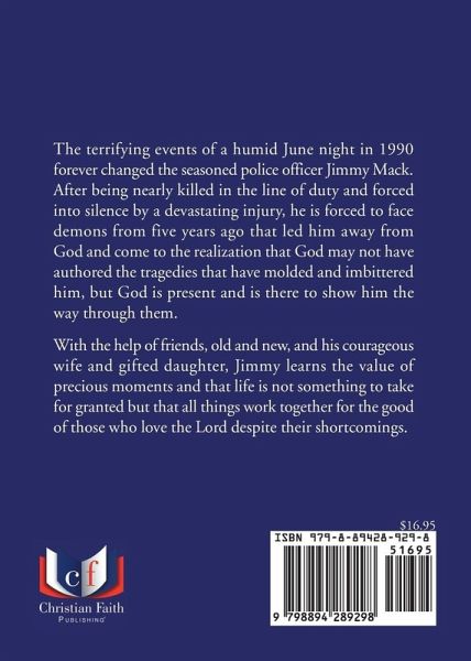 The terrifying events of a humid June night in 1990 forever changed the seasoned police officer Jimmy Mack. After being nearly killed in the line of duty and forced into silence by a devastating injury, he is forced to face demons from five years ago that led him away from God and come to the realization that God may not have authored the tragedies that have molded and imbittered him, but God is present and is there to show him the way through them. With the help of friends, old and new, and his courageous wife and gifted daughter, Jimmy learns the value of precious moments and that life is not something to take for granted but that all things work together for the good of those who love the Lord despite their shortcomings.