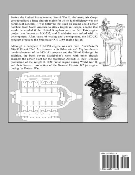 Before the United States entered World War II, the Army Air Corps conceptualized a large aircraft engine for which fuel efficiency was the paramount concern. It was believed that such an engine could power bombers from North America to attack targets in Europe, a tactic that would be needed if the United Kingdom were to fall. This engine project was known as MX-232, and Studebaker was tasked with its development. After years of testing and development, the MX-232 program produced the Studebaker XH-9350 engine design. Although a complete XH-9350 engine was not built, Studebaker's XH-9350 and Their Involvement with Other Aircraft Engines details the development of the MX-232 program and the XH-9350 design. In addition, the book covers Studebaker's work with other aircraft engines: the power plant for the Waterman Arrowbile, their licensed production of the Wright R-1820 radial engine during World War II, and their licensed production of the General Electric J47 jet engine during the Korean War.
